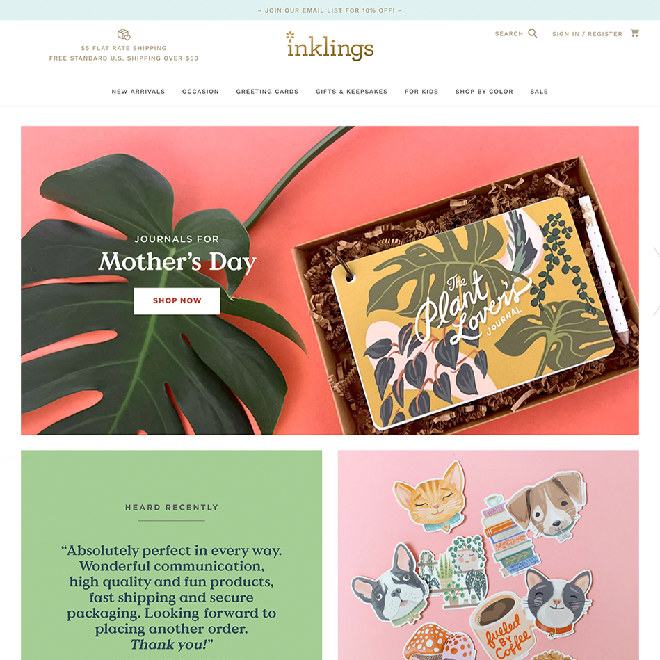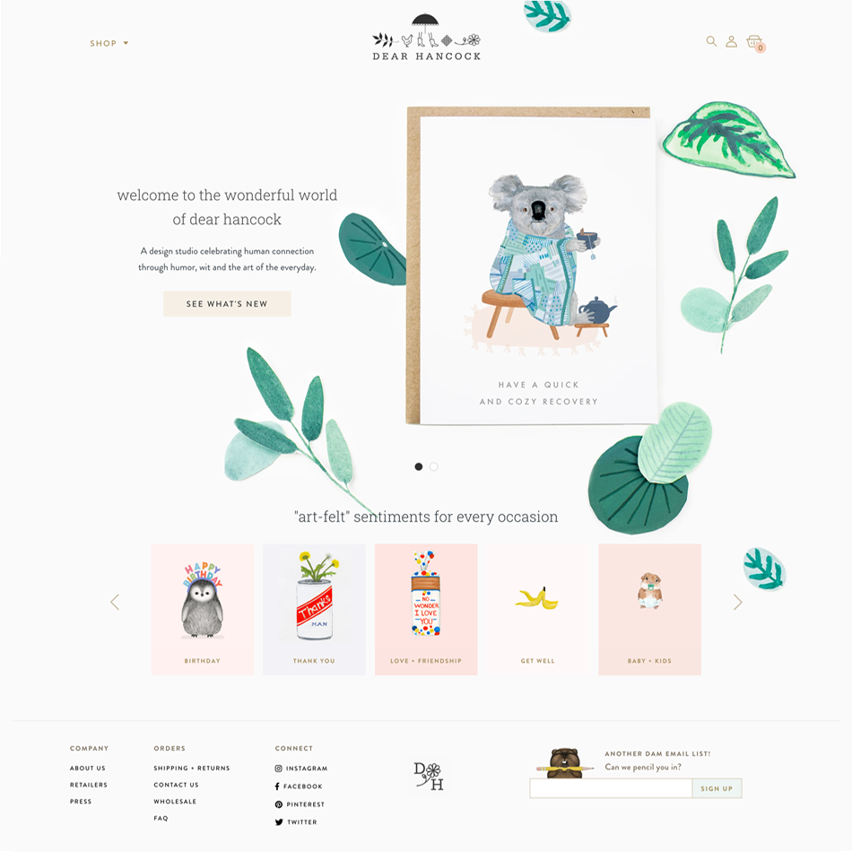 Our clients are typically designers, illustrators, artists, stationers, shopkeepers and other creative entrepreneurs, though we have loved working with any business that values creativity and takes pride in their customer care. We’re passionate advocates for avoiding the “app bloat” that drives frustrated customers away, protecting data and privacy wherever possible, and triple-checking consent with transparent marketing opt-ins. This trust-building protects your brand in layers, greatly reduces buyer burnout, and pays off in high conversion and customer loyalty. (Bonus: ethical sites load faster too.)